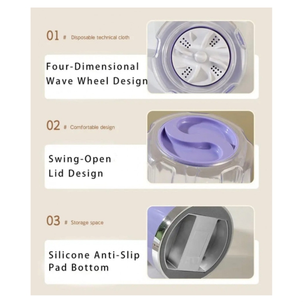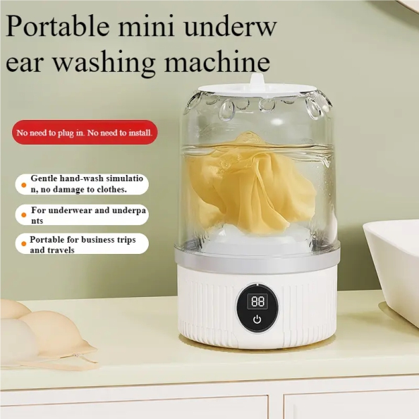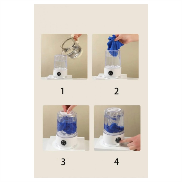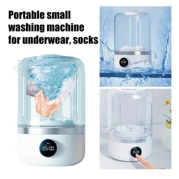 Eπαναφορτιζόμενο πλυντήριο ρούχων mini, εξαιρετικά εύχρηστο και εργονομικό, ιδανικό για εσώρουχα, κάλτσες και μικρού μεγέθους ρούχα. Θα σας λύσει τα χέρια στο ταξίδι σας, στο camping ή και στο σπίτι σας όταν επιθυμείτε να πλύνετε και να φρεσκάρετε οποιοδήποτε μικρό ρούχο σας, μέσα σε 5 μόλις λεπτά, χωρίς να πρέπει να χρησιμοποιήσετε το ενεργοβόρο πλυντήριό σας. Απλά προσθέτετε στο ειδικό δοχείο νερό με απορρυπαντικό, πατάτε το κουμπί, περιμένετε να τελειώσει η πλύση, βγάζετε και ξεπλένετε το ρούχο με καθαρό νερό. Χωρητικότητα 1lt και με αυτονομία μπαταρίας έως 2 πλύσεις.