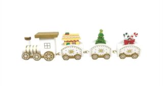 Η ξύλινη αμαξοστοιχία αποτελεί μια μοναδική διακόσμηση που ταιριάζει απόλυτα με την εορταστική ατμόσφαιρα των Χριστουγέννων σε κάθε εσωτερικό χώρο. Βαμμένη λευκή και στολισμένη με χρυσές λεπτομέρειες, δημιουργεί μία κομψή και γοητευτική αίσθηση που προσθέτει μαγεία στο σπίτι κατά τη διάρκεια των εορτών. Μπορεί να τοποθετηθεί σε ένα κομοδίνο, ράφι ή σε κεντρική σύνθεση. Το σετ περιλαμβάνει μια ατμομηχανή και τρία βαγόνια – κάθε βαγόνι είναι εξοπλισμένο με ενσωματωμένα άγκιστρα, που επιτρέπουν την προσάρτηση ή αποσύνδεσή τους κατά βούληση, διευκολύνοντας την προσαρμογή της σύνθεσης.